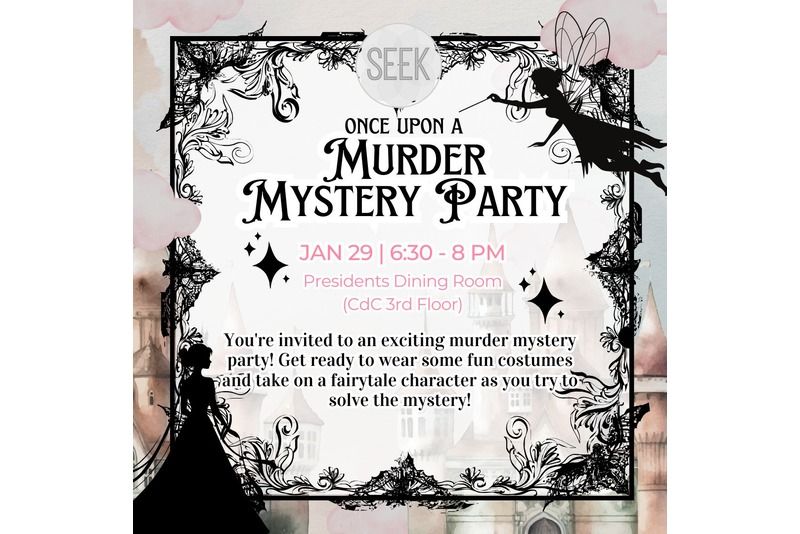SEEK hosts Murder Mystery Party Welcome Back Week Presidents Dining Room (CdC 3rd Floor) January 29, 2025 6:30 - 8:00PM You're invited to an exciting murder mystery party! Get ready to wear some fun costumes and take on a fairytale character as you try to solve the mystery! SEEK , Social , Undergrad Students