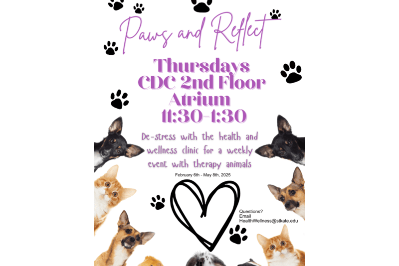 Health and Wellness Clinic hosts Paws & Reflect CDC 2nd floor atrium February 6, 2025 11:30AM - 1:30PM February 13, 2025 11:30AM - 1:30PM February 20, 2025 11:30AM - 1:30PM February 27, 2025 11:30AM - 1:30PM March 6, 2025 11:30AM - 1:30PM March 20, 2025 11:30AM - 1:30PM March 27, 2025 11:30AM - 1:30PM April 3, 2025 11:30AM - 1:30PM April 10, 2025 11:30AM - 1:30PM April 17, 2025 11:30AM - 1:30PM April 24, 2025 11:30AM - 1:30PM May 1, 2025 11:30AM - 1:30PM May 8, 2025 11:30AM - 1:30PM See more dates De-stress with the Health and Wellness Clinic and therapy animals. Academic Support , Adult Students , College for Adults , College for Women , Graduate College , Students