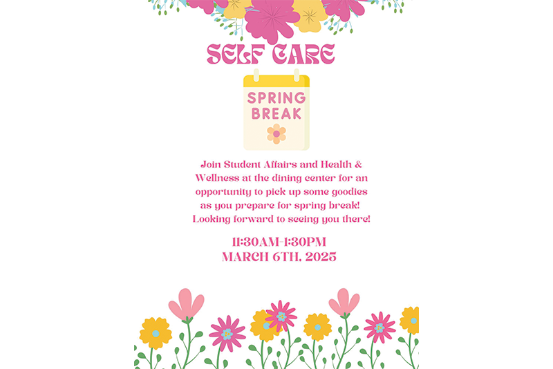 Student Affairs hosts Self Care Spring Break Self Care Spring Break March 6, 2025 11:30AM - 1:30PM Join Student Affairs and Health & Wellness at the dining center for an opportunity to pick up some goodies as you prepare for spring break! Academic Support , Community , Social , Students