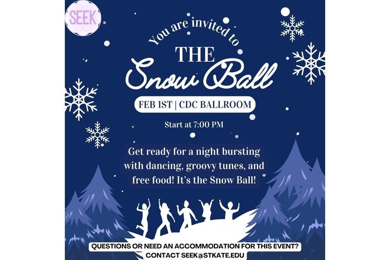 SEEK hosts The Snow Ball Welcome Back Week CdC Ballroom February 1, 2025 7:00 - 10:00PM Get ready for a night bursting with dancing, groovy tunes, and free food! It’s the Snow Ball! SEEK , Social , Undergrad Students