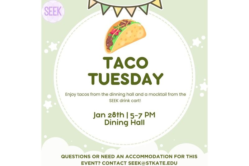 SEEK hosts Taco Tuesday Welcome Back Week Dining Hall January 28, 2025 5:00 - 7:00PM Enjoy tacos from the dinning hall and a mocktail from the SEEK drink cart! All Campus , SEEK , Social